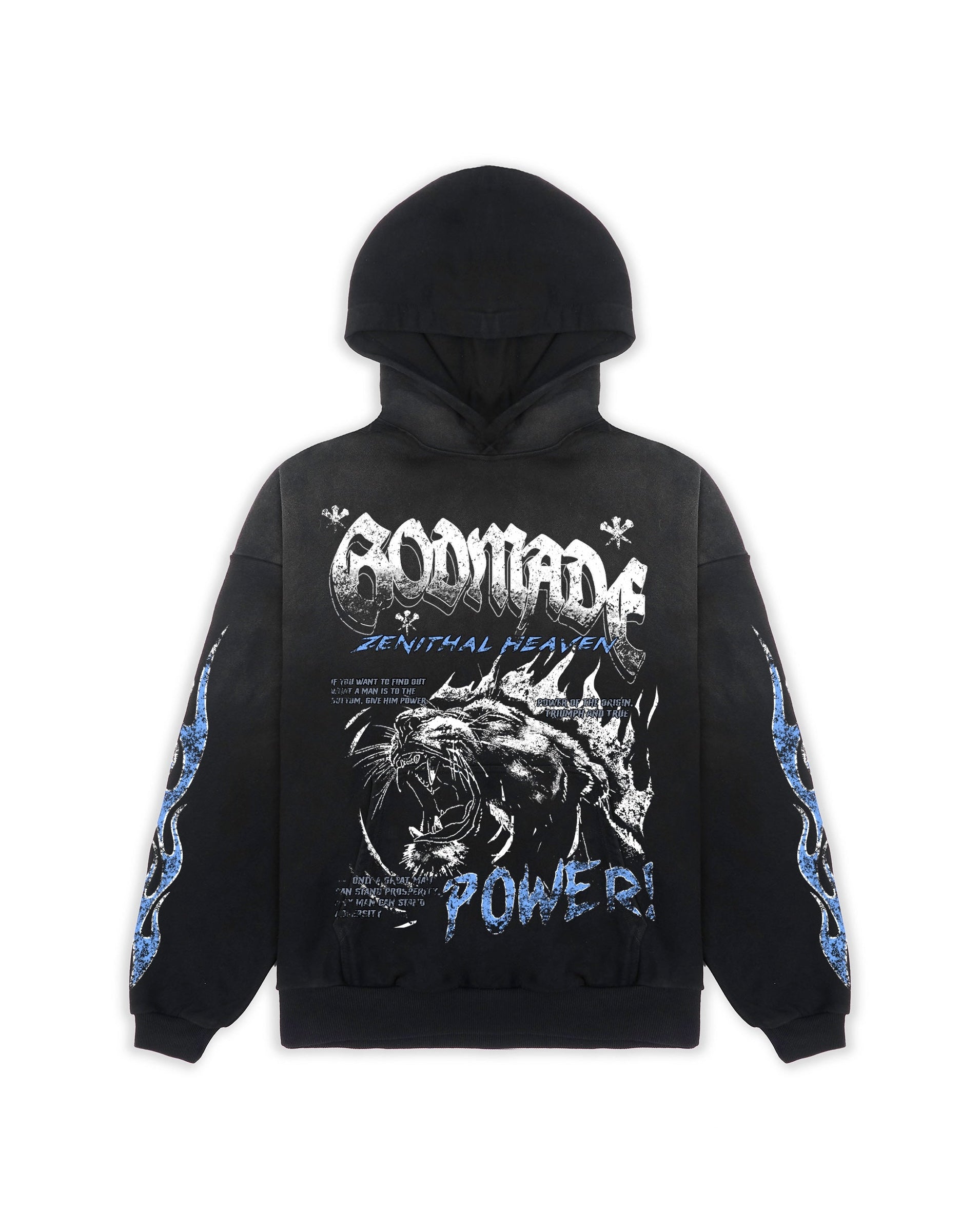 Power black hoodie in heavy loopback cotton. Oversized fit with ribbed hem, and cuff. Made from heavy-weight cotton to ensure quality and longevity. Finishing this piece with power design.