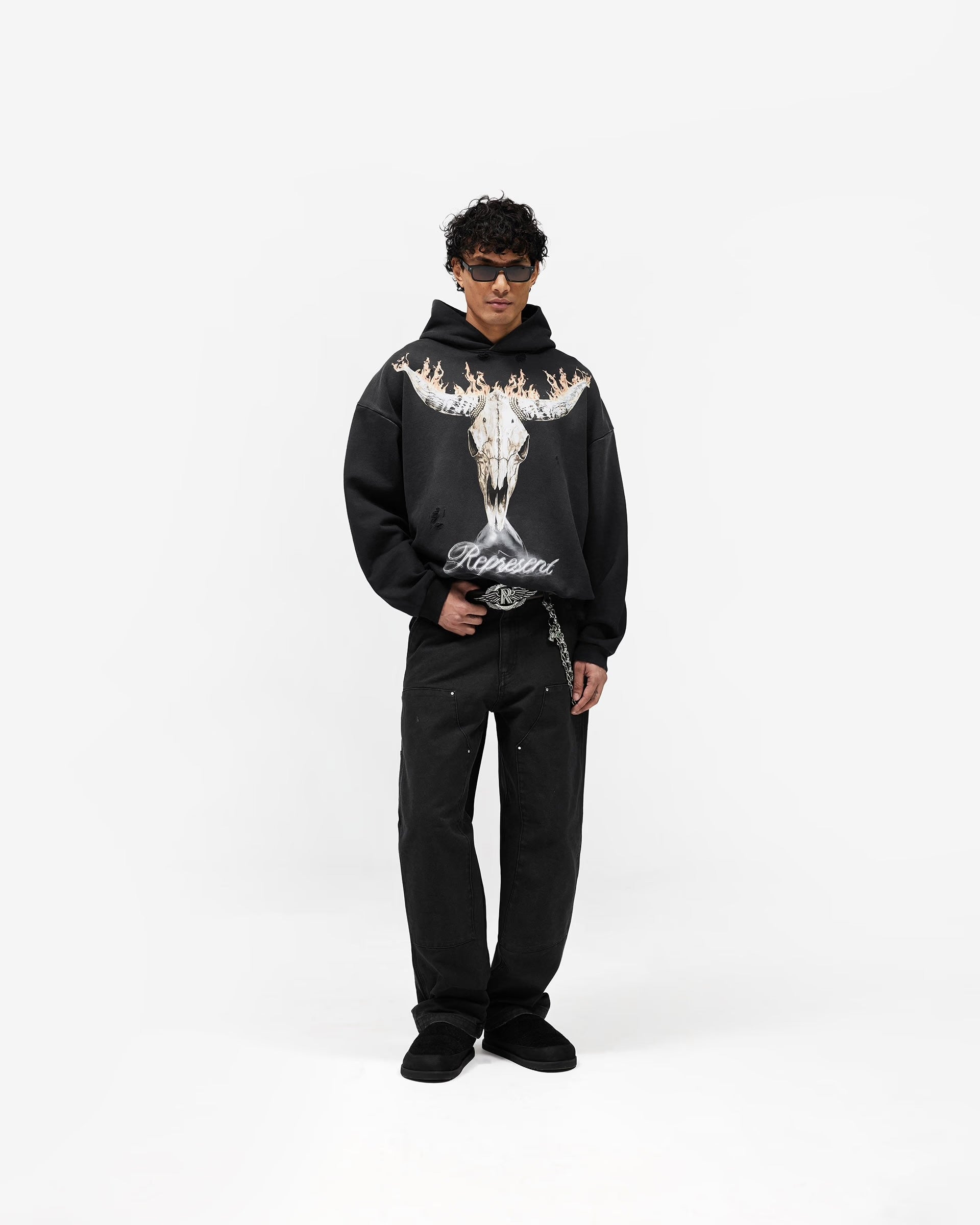 Metal claw studs are applied through the front artwork, creating a tactile, dimensional finish. Distressing across the body and armholes enhances the lived-in look, while a double layer hood, signature metal bar at the hem, and Represent sign-off complete the construction.