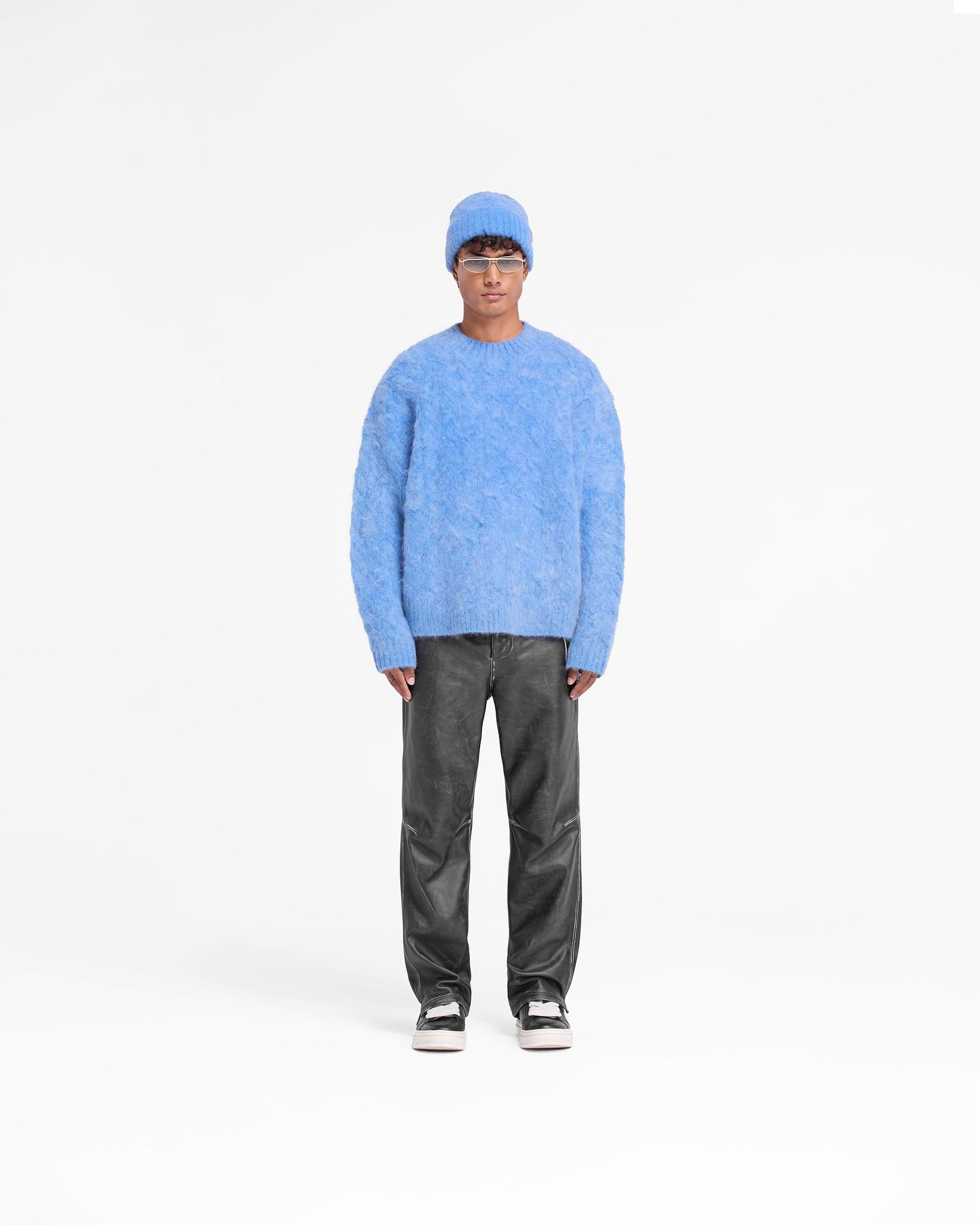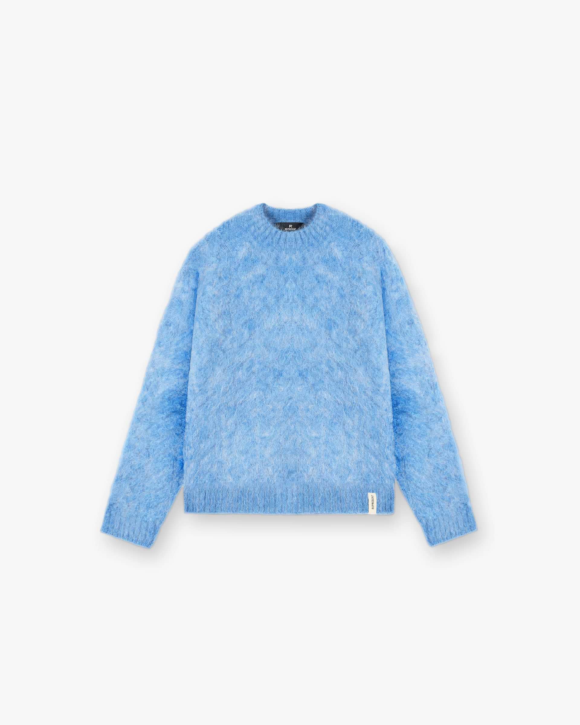 Introducing the Cable Knit Jumper in Electric Blue, a very oversized mohair jumper crafted with ribs to the hem, cuffs and collar, finished with a Represent tab to the hem.