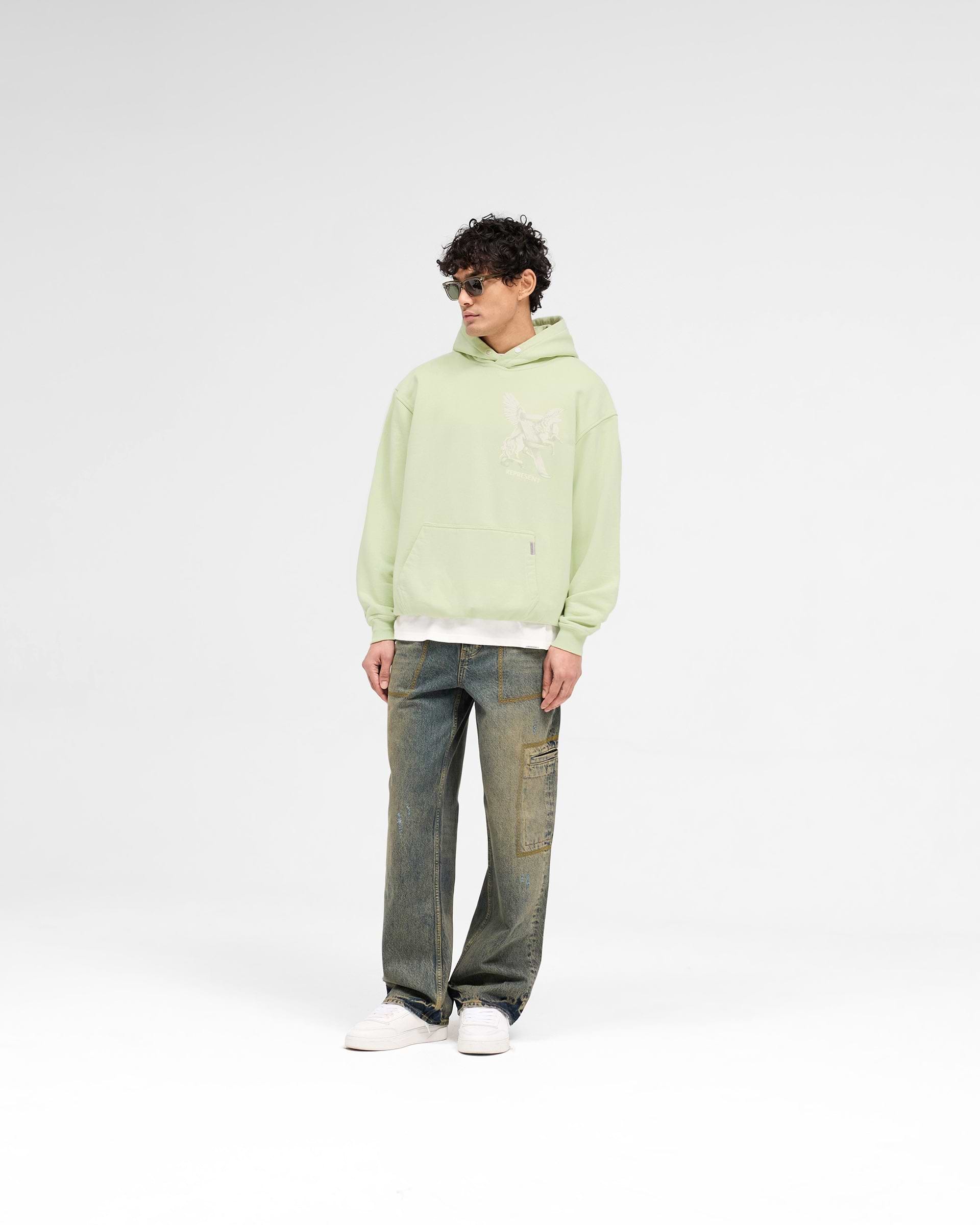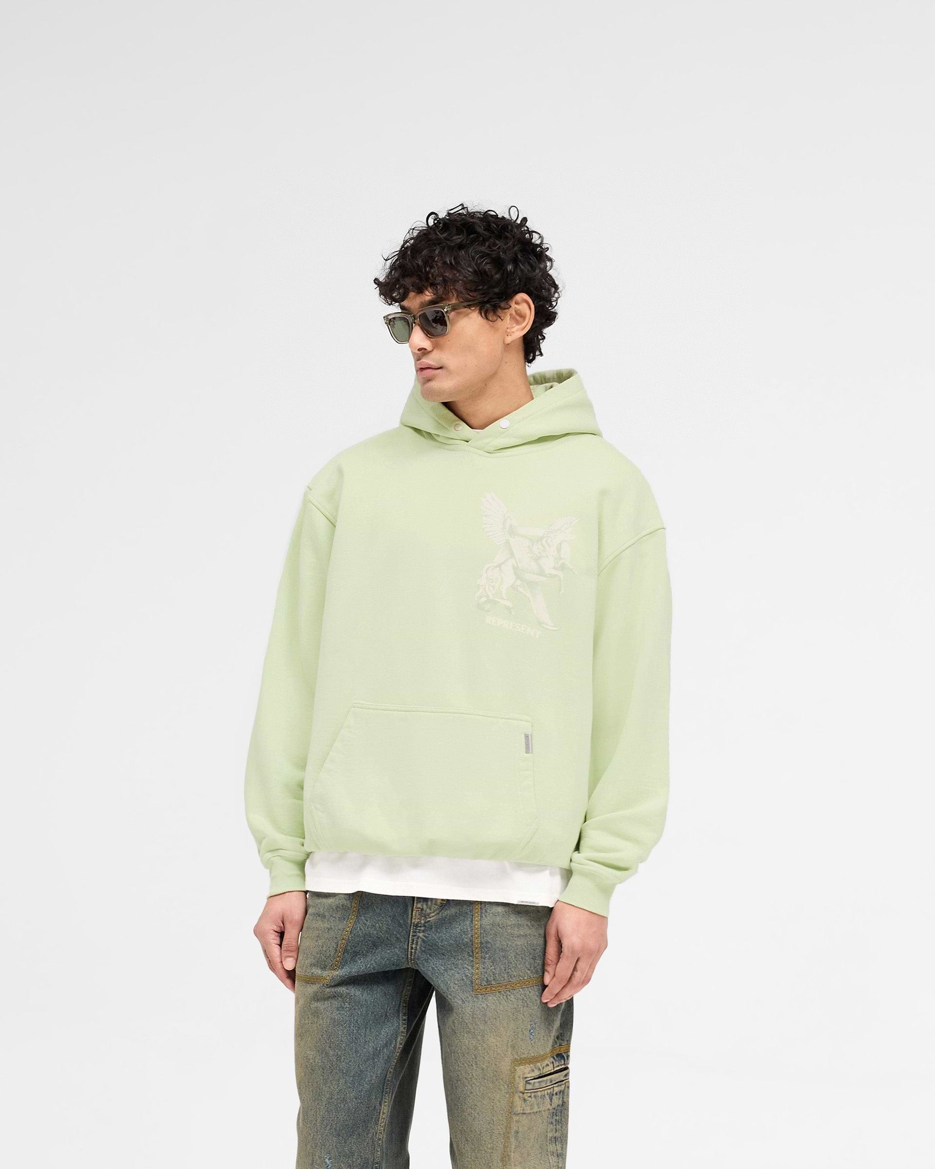 This season's statement colourway from the Represent Overdrive collection, this Matcha green Elegance in Motion Hoodie has been crafted from 100% heavyweight cotton for a proper comfortable layering essential for your wardrobe. Detailed with all the usual trimmings of your most-loved hoodie, including a Cobrax popper to the hood, a kangaroo pouch pocket and statement graphics to the front and back of the garment.