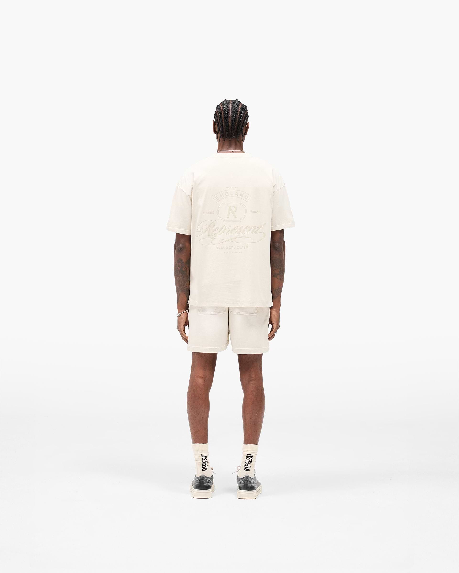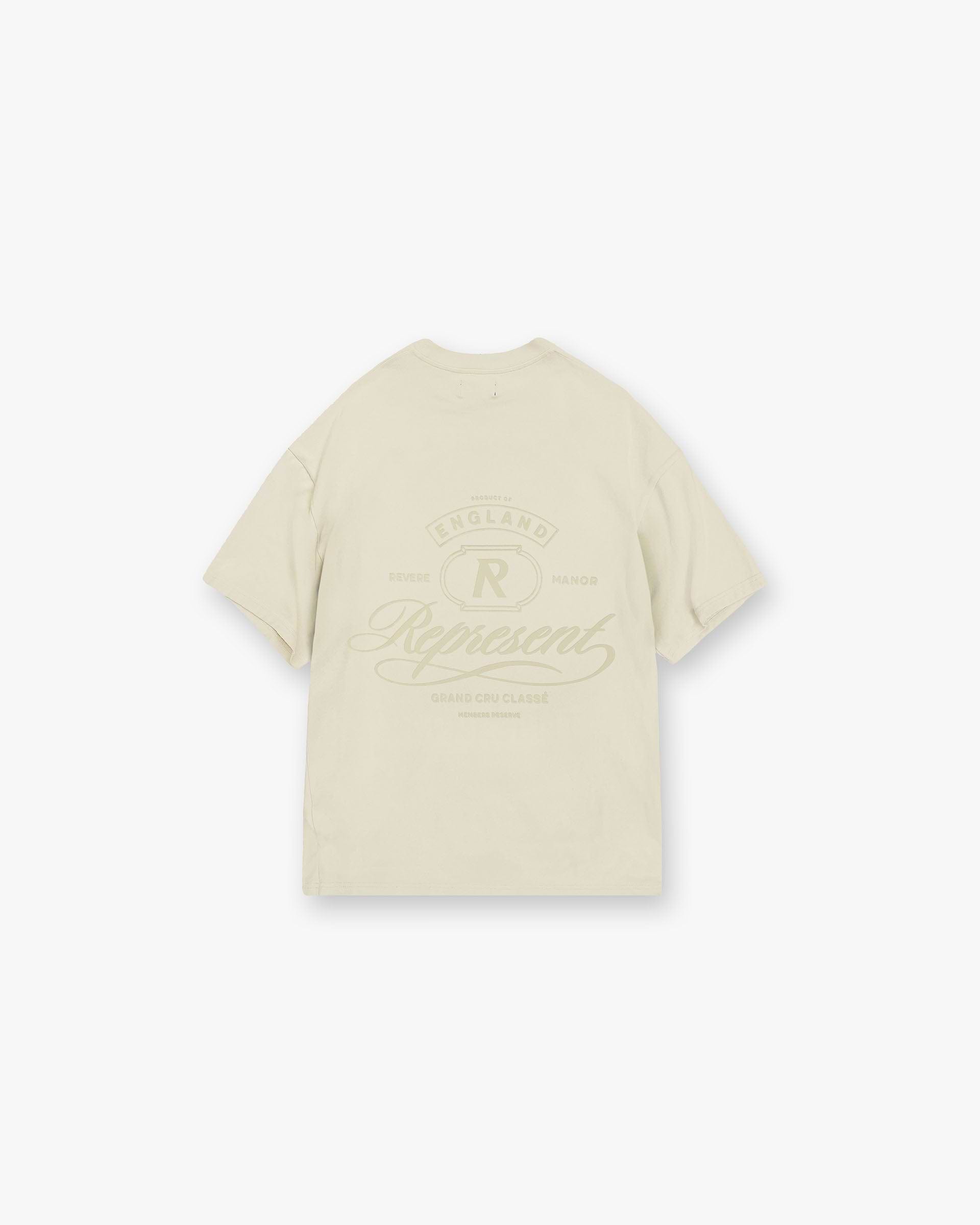 Introducing the Grand Vintage T-Shirt in Champagne, crafted from a new 220gsm fabric designed to feel cooler to the touch. With a standard oversized fit, this tee features tonal Grand Cru branding front and back, mirroring the design of the Grand Vintage Hoodie. Finished with a Represent metal bar at the hem and treated with a garment dye for a soft vintage look.