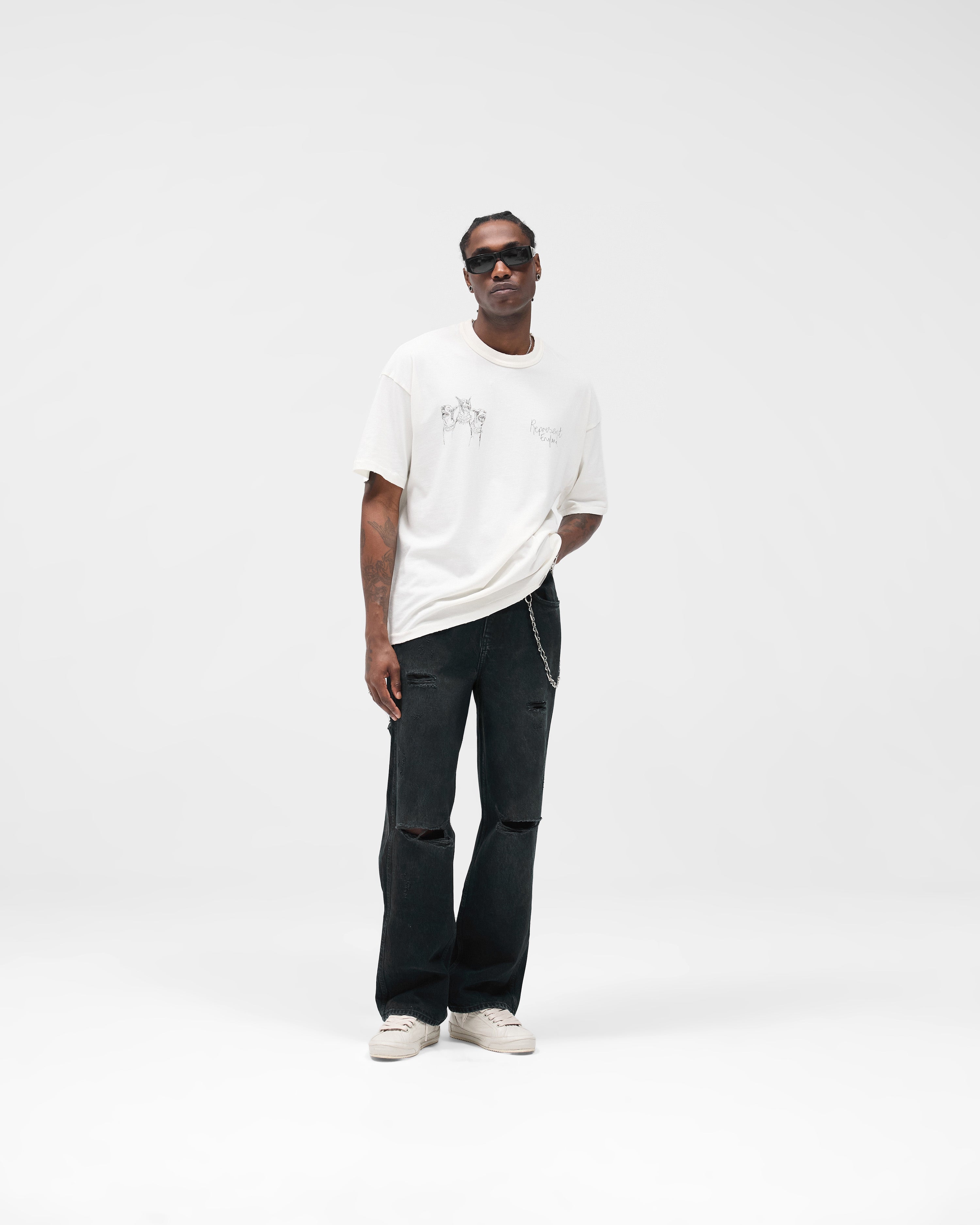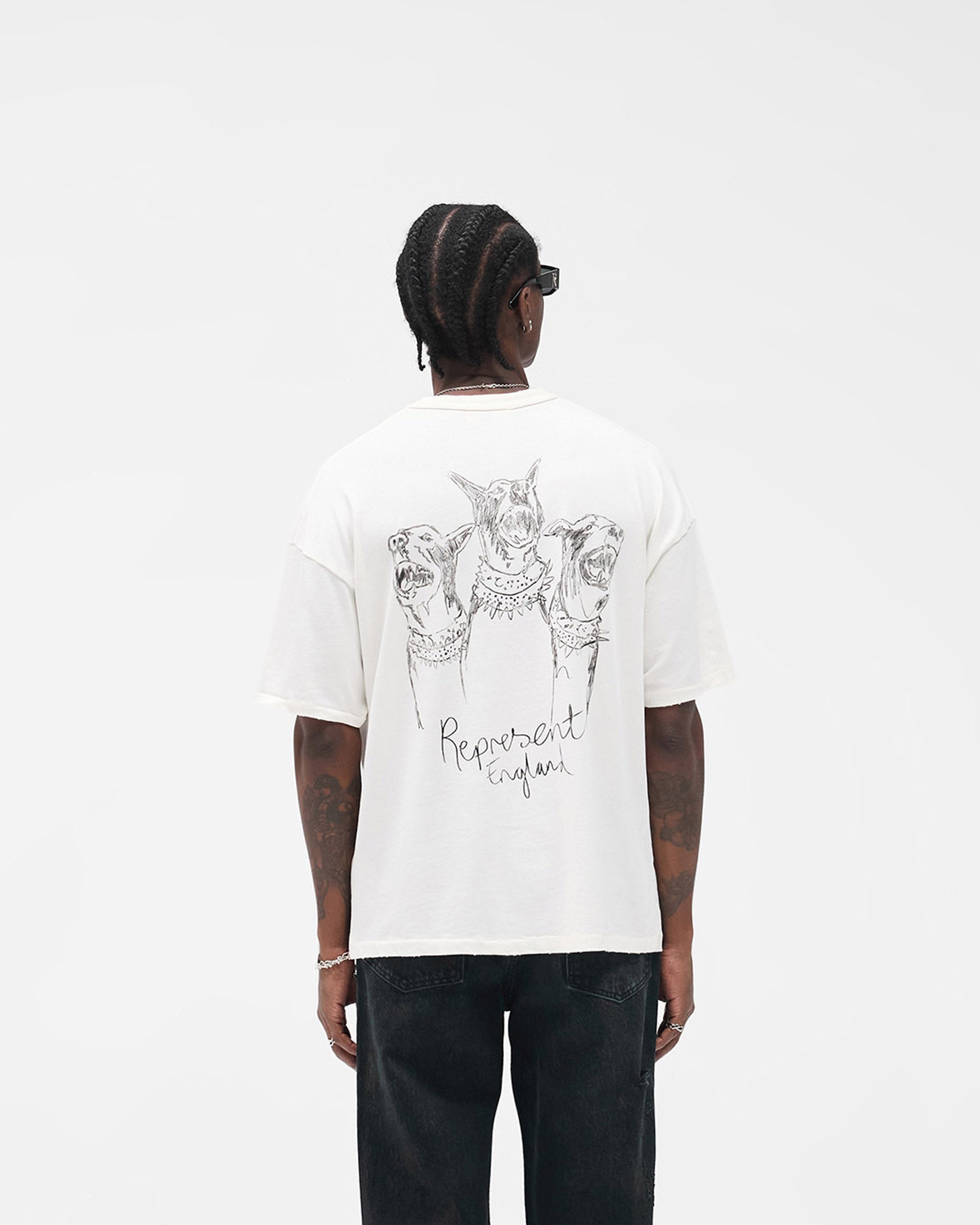 Introducing the Hand Drawn Thoroughbred T-Shirt in Flat White, crafted from 220GSM cotton with an oversized fit. The t-shirt carries a hand-drawn Thoroughbred graphic with Represent England script across the chest and back. Designed with a rib collar and ladder stitch detailing, the piece is subtly distressed at the hem and cuffs for a vintage edge. Finished with our signature metal bar at the hem.