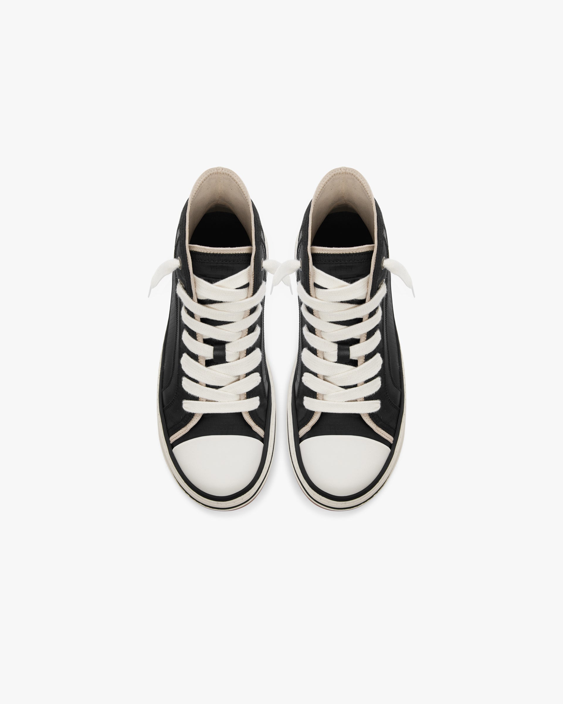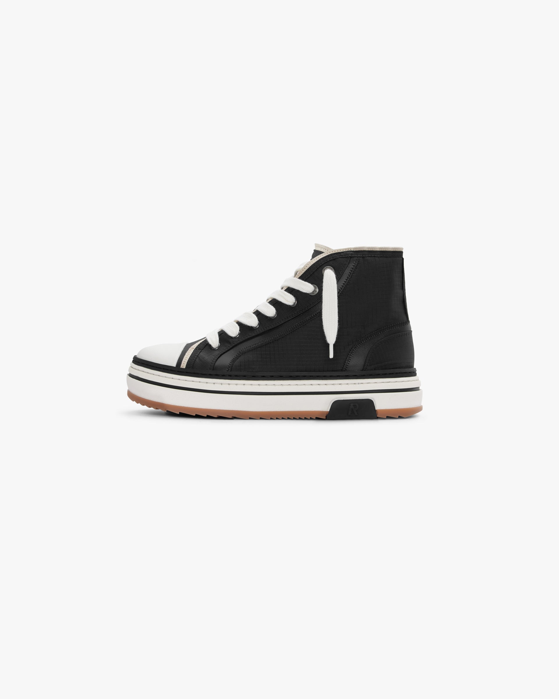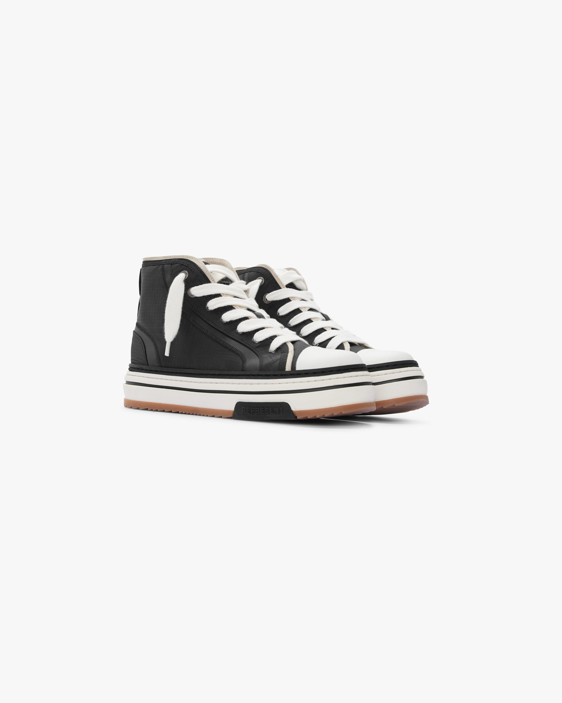 The HTN X High in Black/Vintage is a high top sneaker; with a ripstop textile upper and nylon bound edge for layering, the shoe has branded metal eyelets and chunky lacing. It features a chunky rubber outsole branded with the Initial and Represent logo as well as a Represent branded tongue patch.