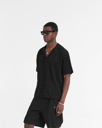 Introducing the Lace Knit Shirt in Black, a luxury shirt crafted from 100% organic cotton. The lace knit shirt has been created with a crochet knit pattern with our Initial logo delicately crafted into the design. It has an oversized fit for easy summer wearing.