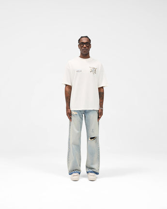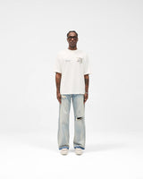 The Legacy Cherubs T-Shirt in Flat White is crafted from 100% cotton at 220gsm with a soft carbon finish. Designed to our standard oversized fit, it features a ribbed collar and twin needle finish to the hem and cuffs for durability. The piece is completed with our signature metal bar at the hem and a high build screen print graphic of the cherubs to the chest and back.