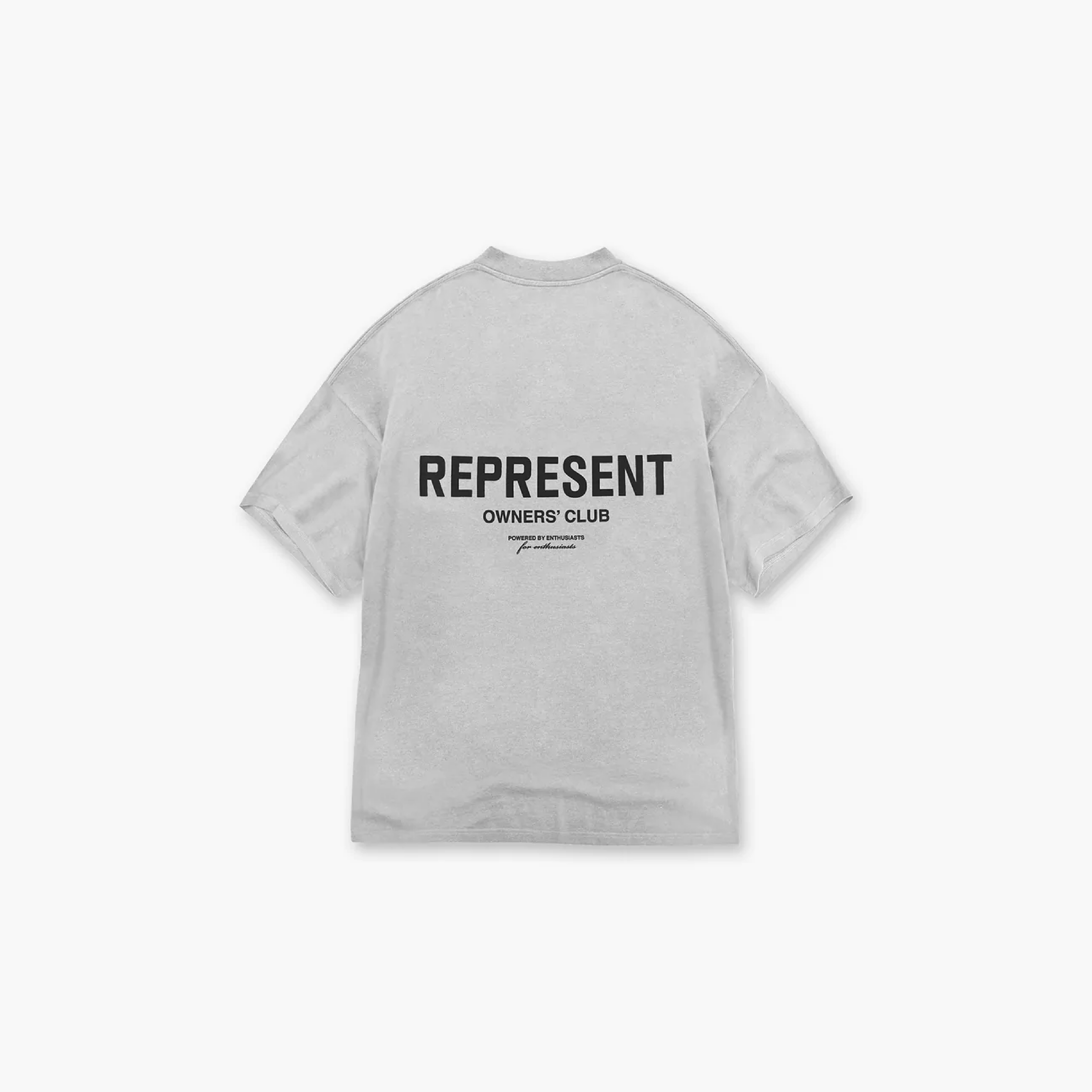 Short sleeve jersey ash grey t-shirt. Slightly oversized fit in a medium weight cotton. Ribbed crewneck collar. Represent Owners Club graphic branding to the rear and chest. Logo bar to the hem.