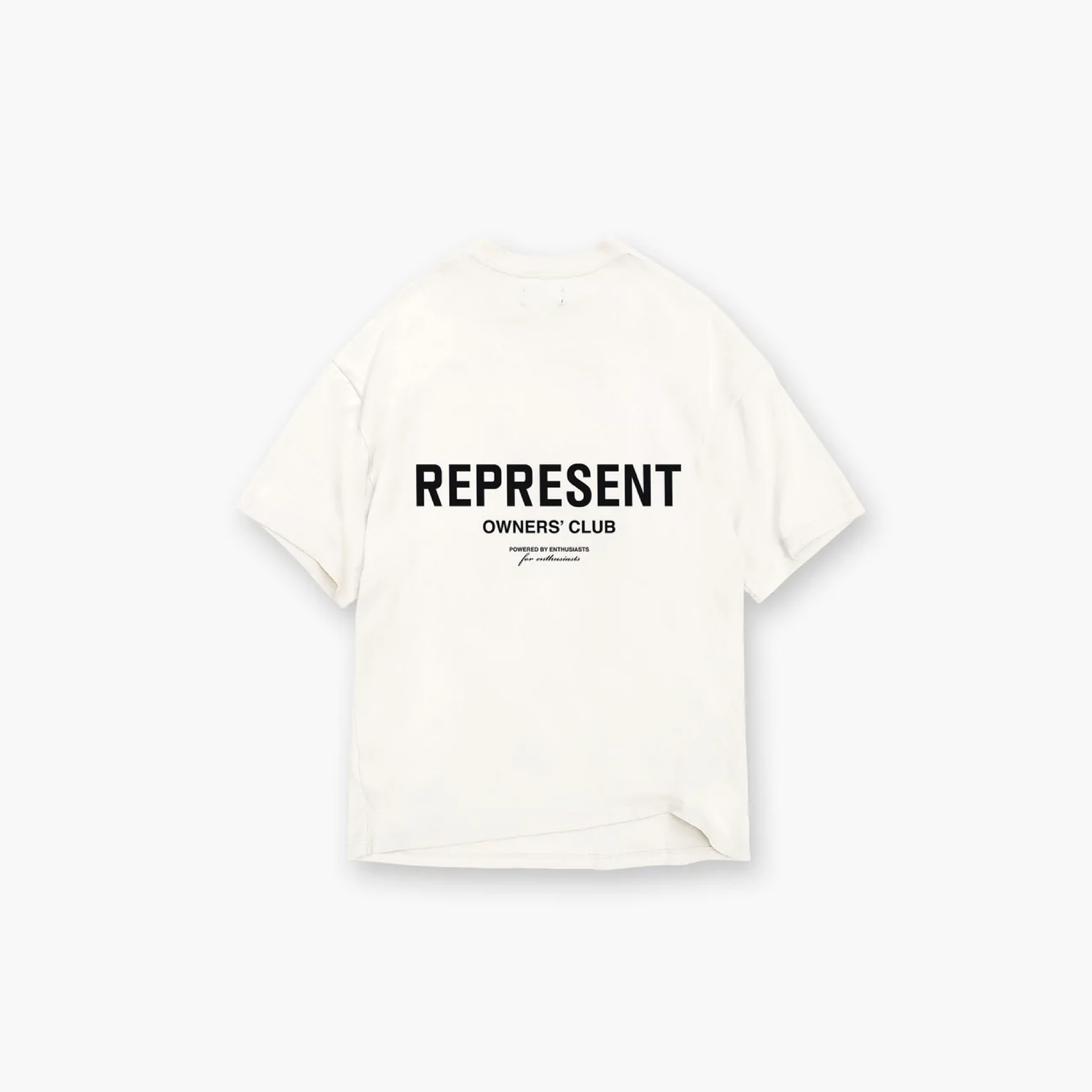 Short sleeve jersey flat white t-shirt. Slightly oversized fit in a medium weight cotton. Ribbed crewneck collar. Represent Owners Club graphic branding to the rear and chest. Logo bar to the hem.