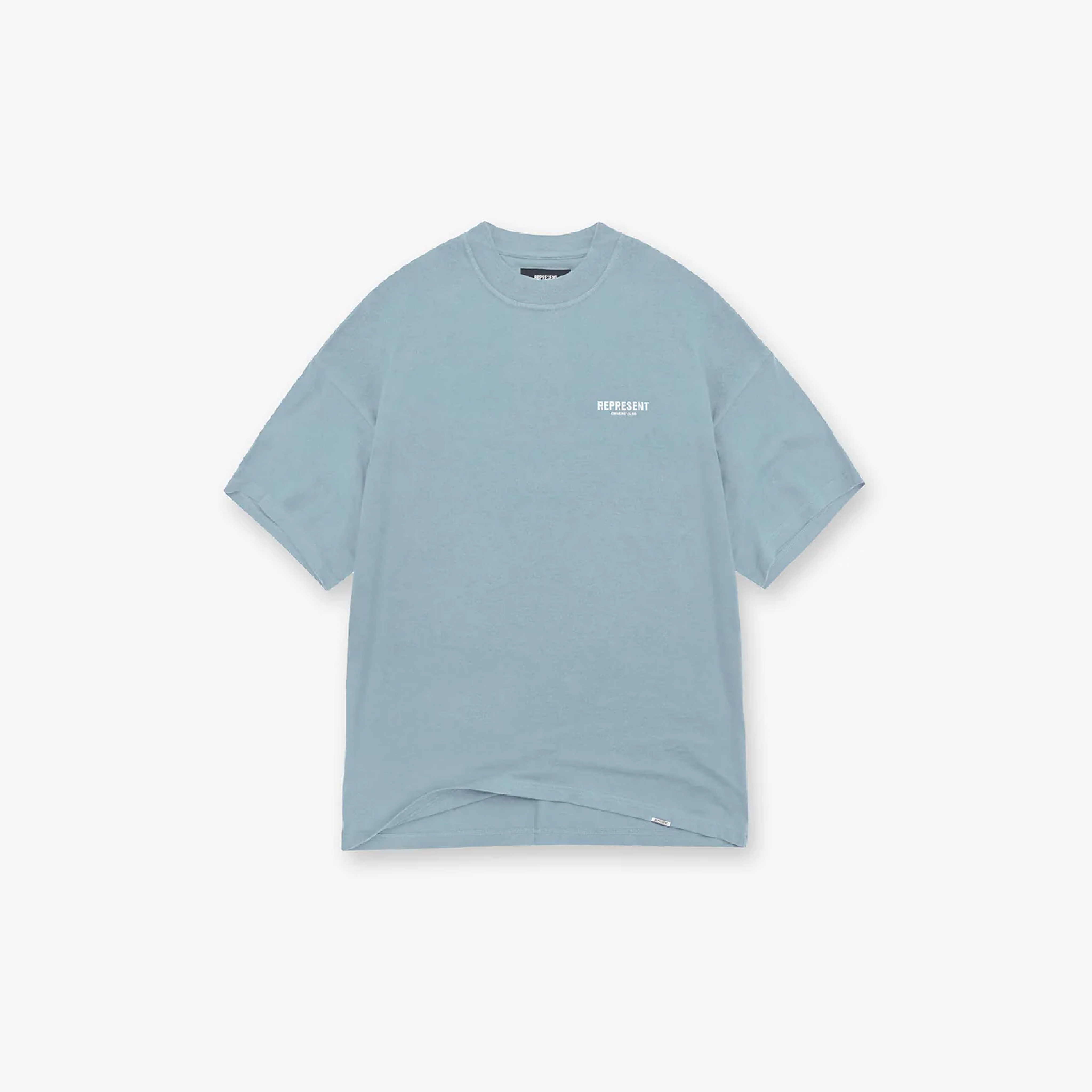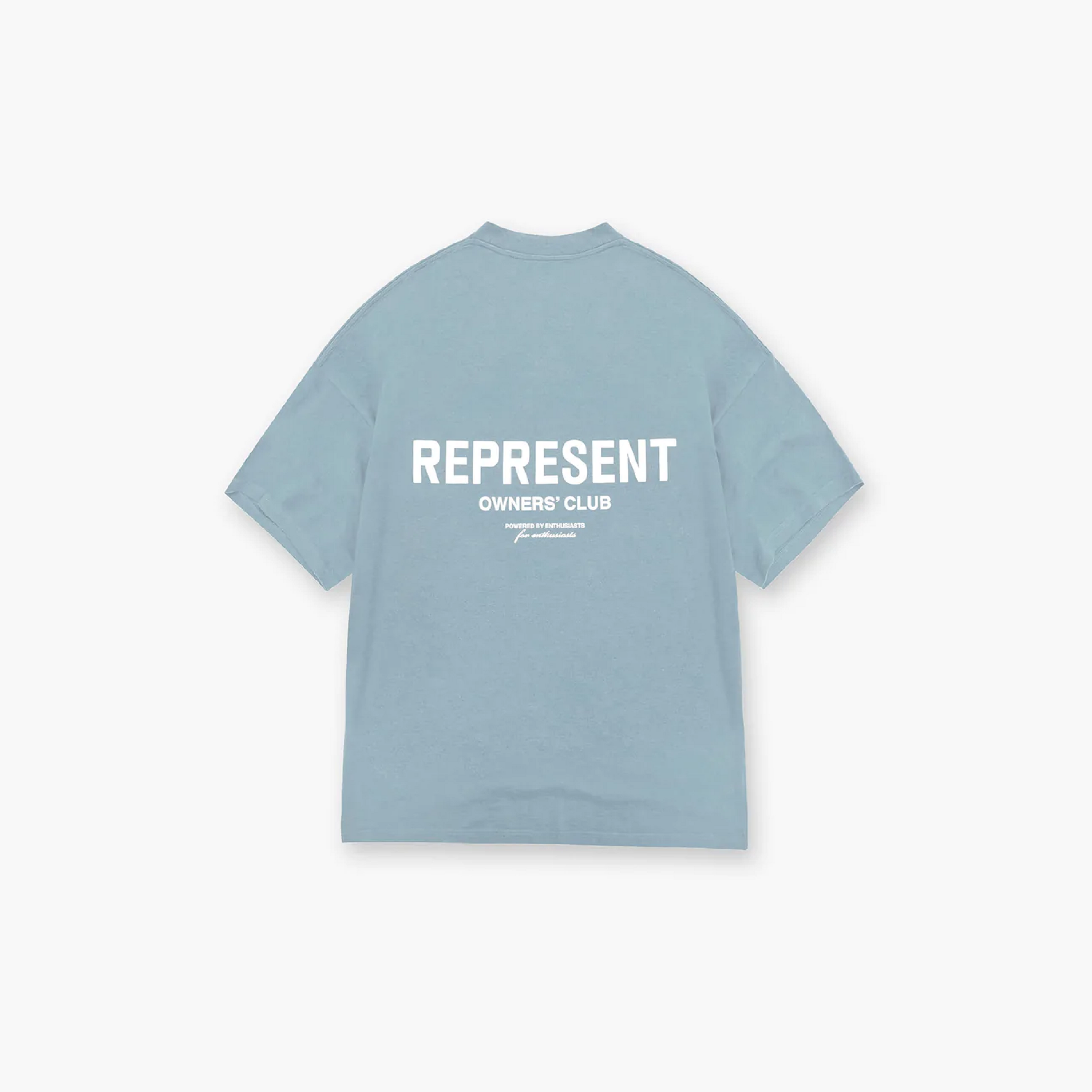 Short sleeve jersey powder blue t-shirt. Slightly oversized fit in a medium weight cotton. Ribbed crewneck collar. Represent Owners Club graphic branding to the rear and chest. Logo bar to the hem.