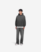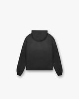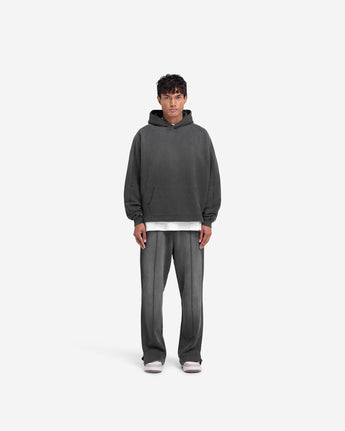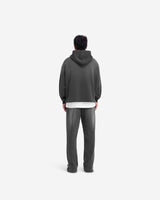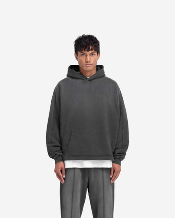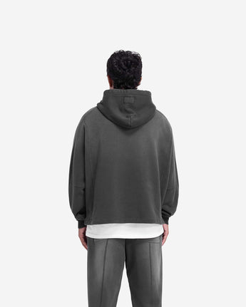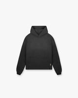 Introducing the Stepped Hem Hoodie in Stained Black, a luxury oversized hoodie crafted with a fade out wash for an authentic vintage look. The hoodie showcases a split stepped hem, with a ribbed trim edge to the pocket. It is finished with a self fabric raw edge patch to the hood, and a Represent branding tab to the side seam.